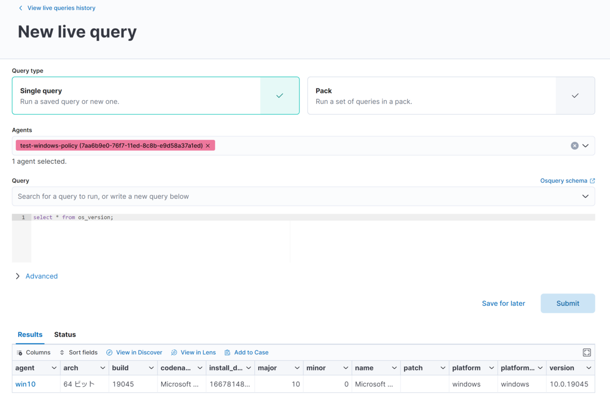 Integration を追加すると左のメインメニューに OSquery が追加されます。New Live Query からクエリをたたくことができます。