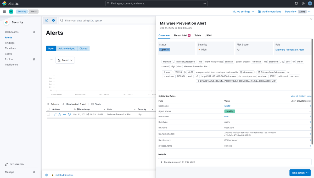 最初に Security -> Manage -> Rules より Manage rules を押下し、elastic の prebuilt のルールをロードします。とりあえず EICAR テストファイルをダウンロードしてみます。