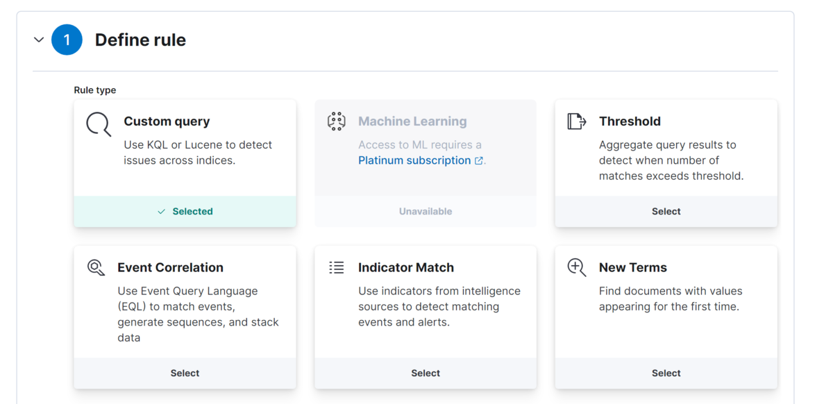 | Custom Query | 普段 Kibana で検索をするときに使っている KQL(Kibana Query Language)で記述するルール。検索に一致するログがあればアラートが上がる。 |