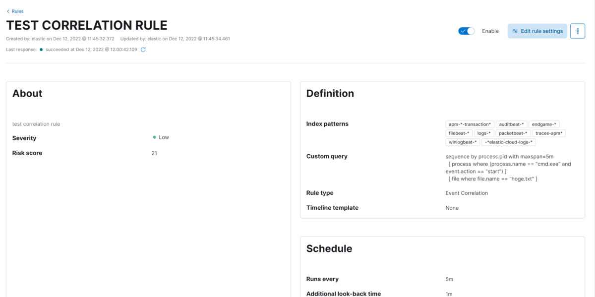 | Event Correlation | EQL(Event Query Language)でルールを記述する。複数の条件を順序付きで記述でき、それらの条件に一致するログがシーケンシャルに発生した際にアラートを上げる |