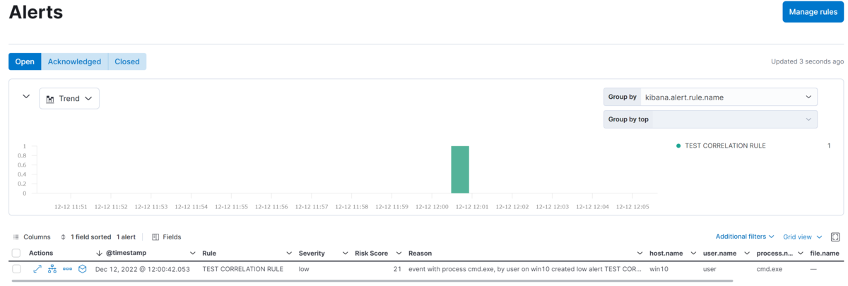 EQL では sequence ブロックで複数の条件を時系列的に定義できます。maxspan句でマッチをかける最大の期間を設定することができるほか、by句で指定したフィールドが同じ値を持つものについてマッチをかけることができます。よって上のルールは「cmd.exe という名前を持つプロセスがスタートしてから5分以内に hoge.txt というファイルを操作した」という条件になります。