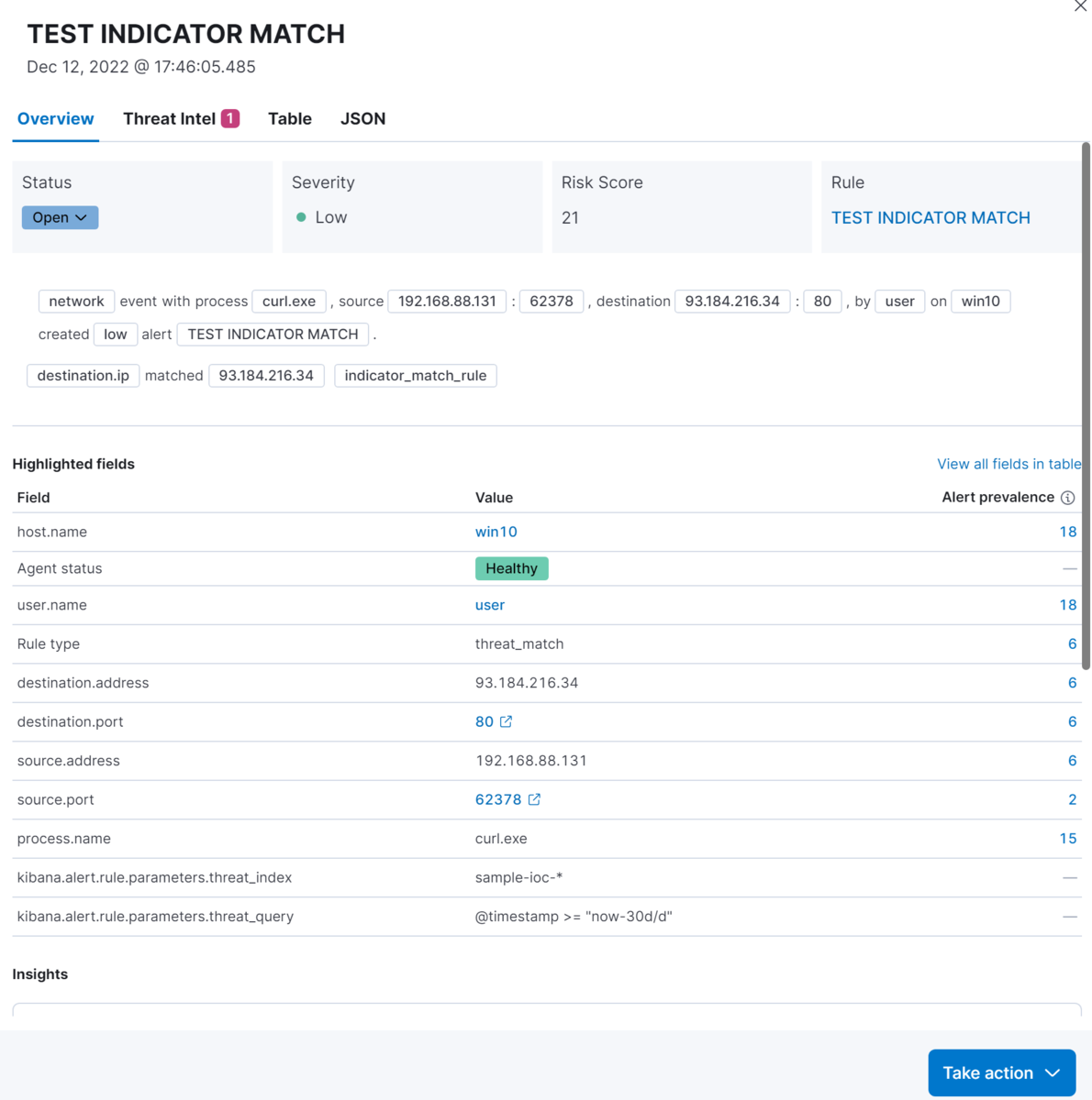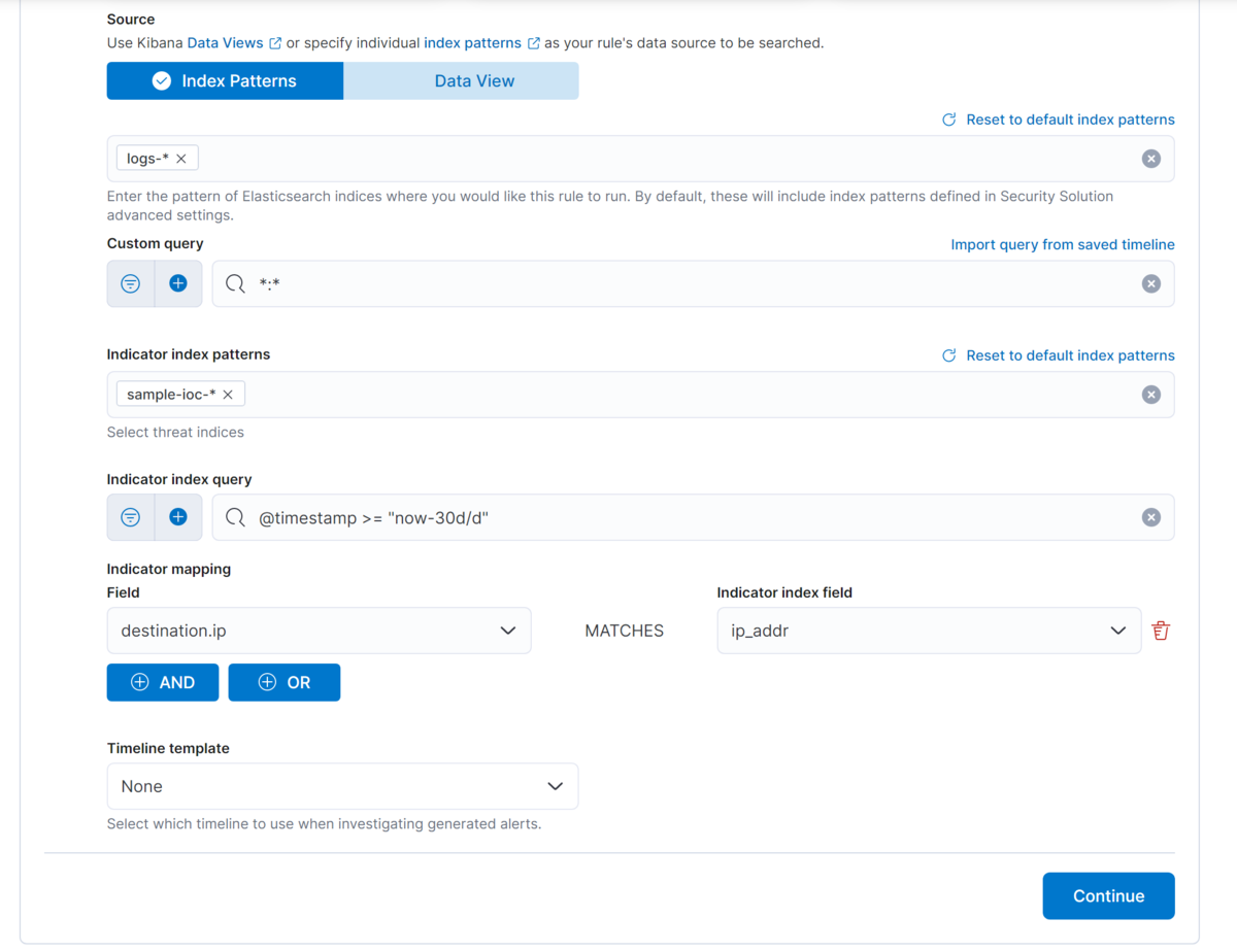 Indicator Match に使用するインデックスには、@timestamp のフィールドが必須なことに注意します。