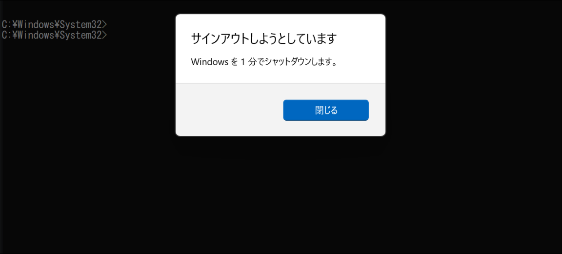 - 1時間後、画面上にシャットダウンに関するポップアップが表示されました。キャンセルするような選択肢やシャットダウンまでの時間を変更する選択肢はありませんでした。ポップアップを閉じると、表示の時間内であれば操作できましたので、そのうちに保存などをする時間は短いですがあります。