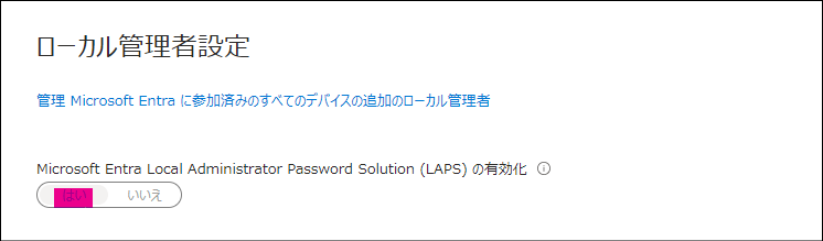 1. Microsoft Entra 管理センターにて、デバイス>すべてのデバイス>デバイスの設定>ローカル管理者設定 からLAPSを有効化します